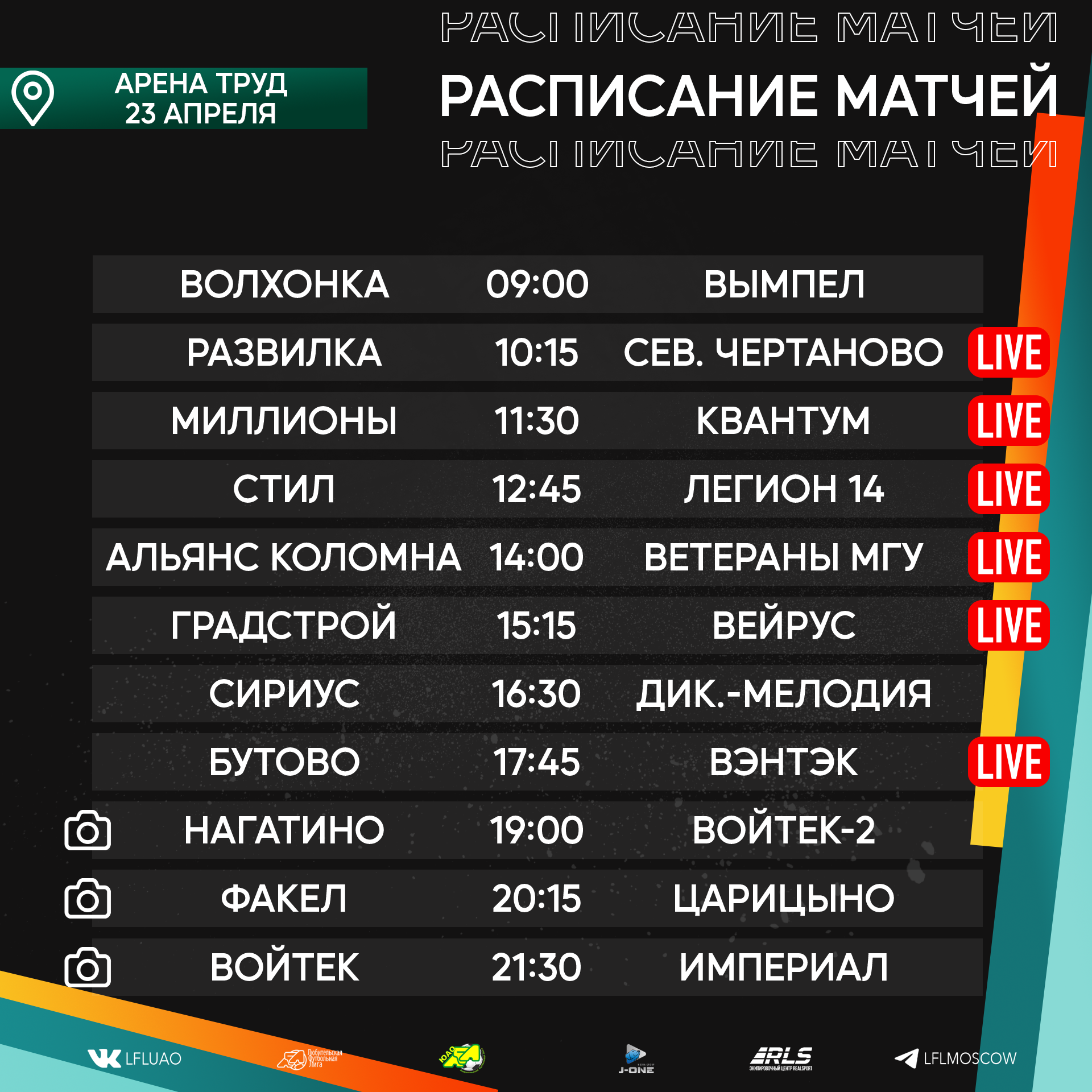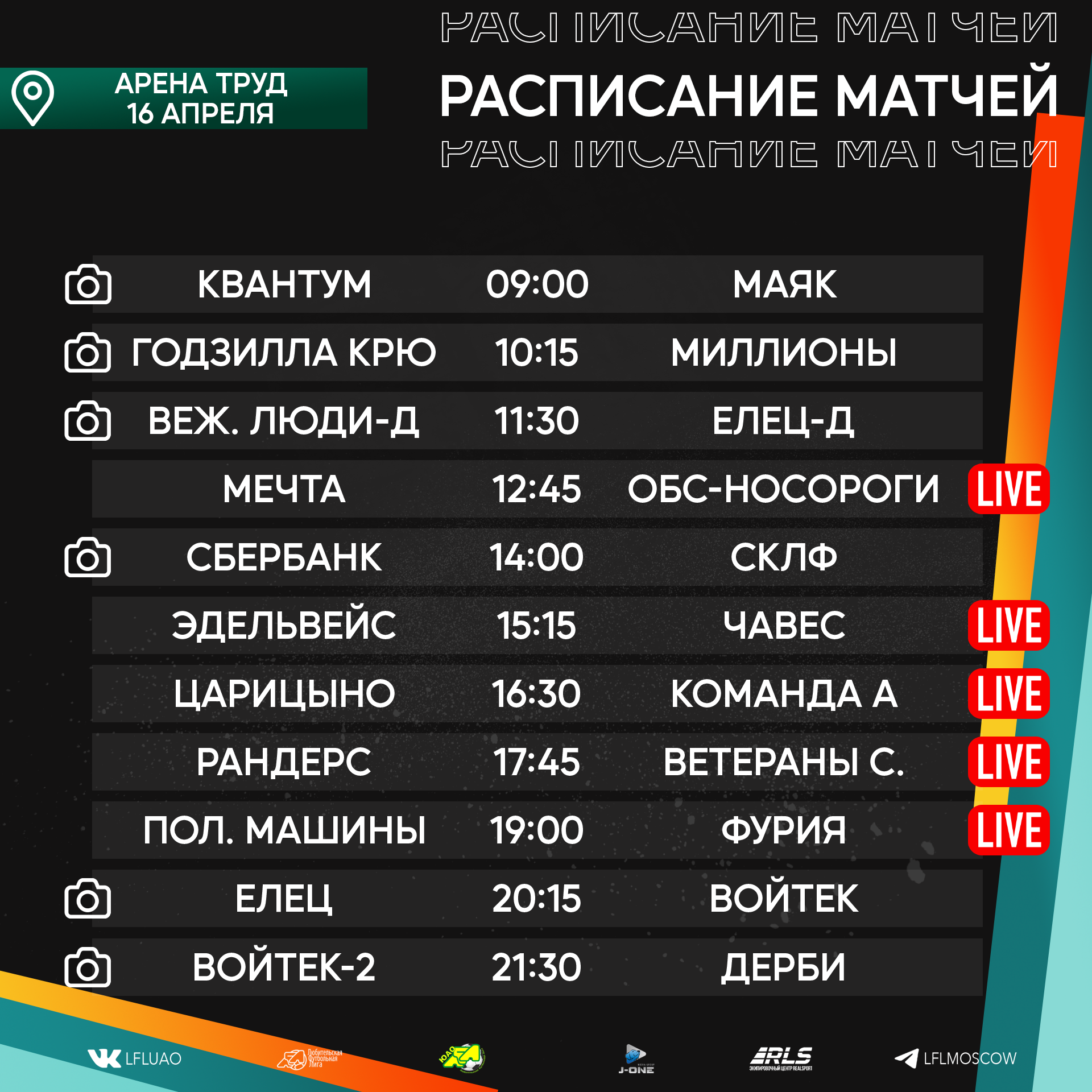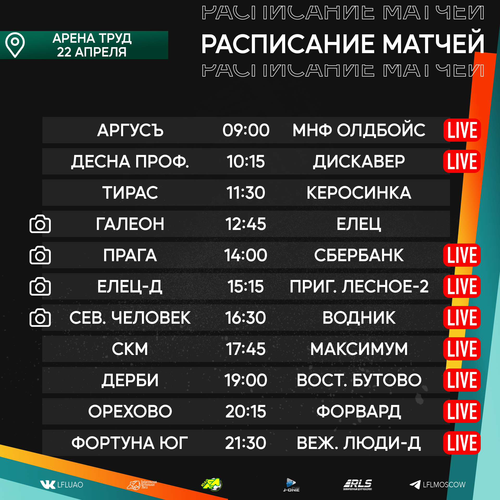 Медиа21.04.2023 Новый футбольный уик-энд уже выглядывает из-за горизонта, а мы с вами готовимся встречать его, ведь нас ожидает ряд интереснейших противостояний во внутренних чемпионатах Подробнее21.04.2023 «Дайджест 2. КФЛ 2023. Вратарская пятница, звонок Неймару и голы в ворота Акинфеева». Сейчас большинство людей получают информацию или проводят большую часть времени в социальных сетях. Для этого мы ведем наши странички в Телеграмме (https://t.me/CFL2023_Moscow) и Вконтакте ( https://vk.com/lfl__russia ), на которые стоит безусловно подписаться. Подробнее20.04.2023 Расписание медиа Южной лиги ЛФЛ Представляем вашему вниманию расписание медиа Южной лиги ЛФЛ на предстоящий футбольный уик-энд Подробнее19.04.2023 Записи трансляций матчей с игровой недели 14-16 апреля Творческий коллектив Южной лиги ЛФЛ представляет вашему вниманию записи трансляций матчей, прошедших в выходные дни Подробнее19.04.2023 CFL 2023. Дайджест новостей № 1 Все новости читайте на официальной странице CFL cfl.lfl.ru Подробнее18.04.2023 Разбор полётов. Седьмая неделя Позади очередной футбольный уик-энд, который подарил нам немалое количество эмоций. Прошедшая неделя многим запомнится невероятными интригами, развязками Подробнее18.04.2023 Южная Лига ЛФЛ проводит донабор команд на сезон 2023 В связи с открытием нового стадиона Ясенево Южная Лига ЛФЛ проводит донабор команд на сезон 2023 Подробнее14.04.2023 Подходят к концу рабочие будни, а это означает, что впереди нас ожидает яркий и эмоциональный футбольный уик-энд. Календарь подарил нам немало интересных вывесок Подробнее13.04.2023 Расписание медиа Южной лиги ЛФЛ Представляем вашему вниманию расписание медиа Южной лиги ЛФЛ на предстоящий футбольный уик-энд Подробнее12.04.2023 Мы начинаем серию публикаций, в которых будем знакомить наших читателей с командами участниками КФЛ 2023. А также представлять вашему вниманию звезд турнира, его участников, комментаторов и болельщиков. Все это в ближайшее время на нашем сайте и в социальных сетях. Подробнее |