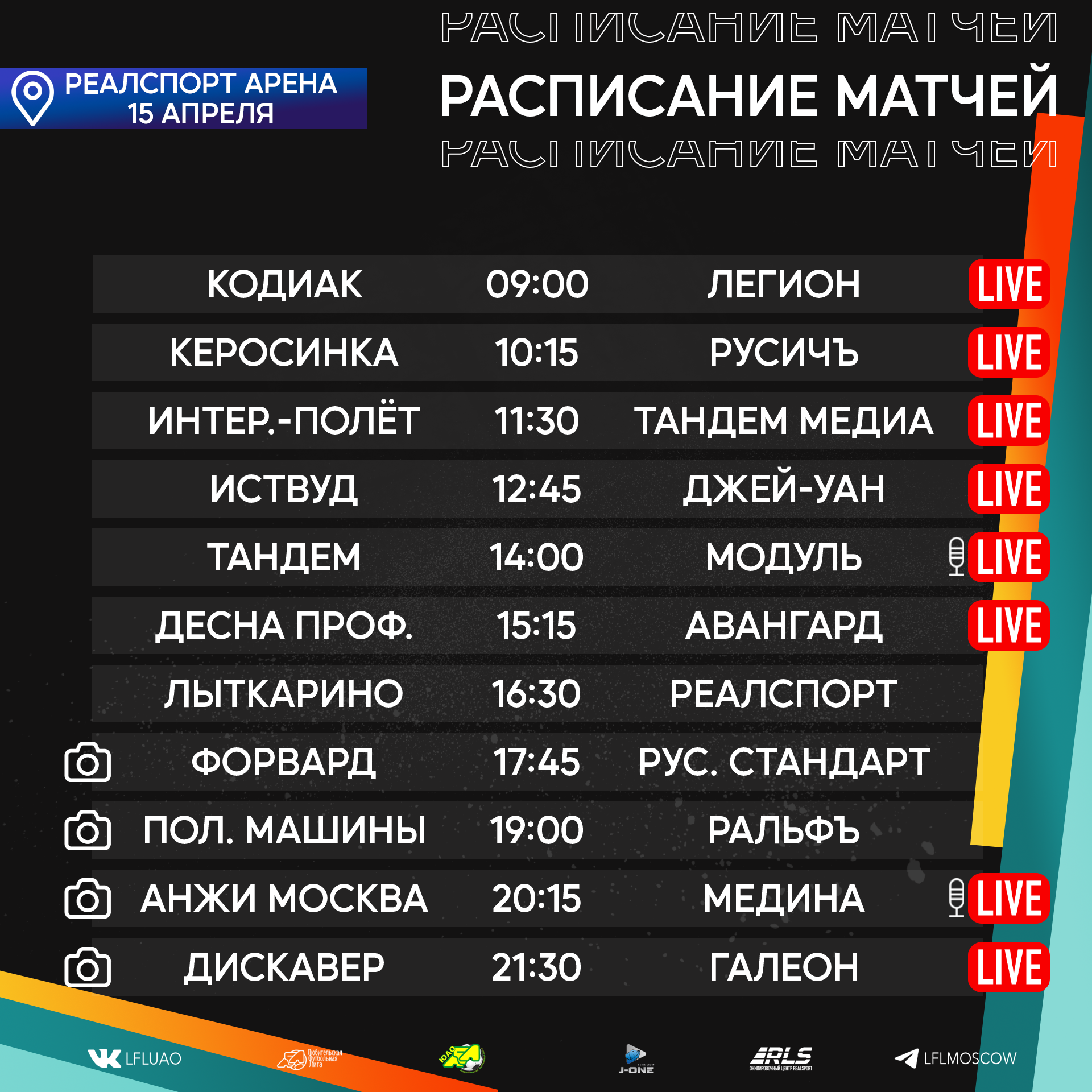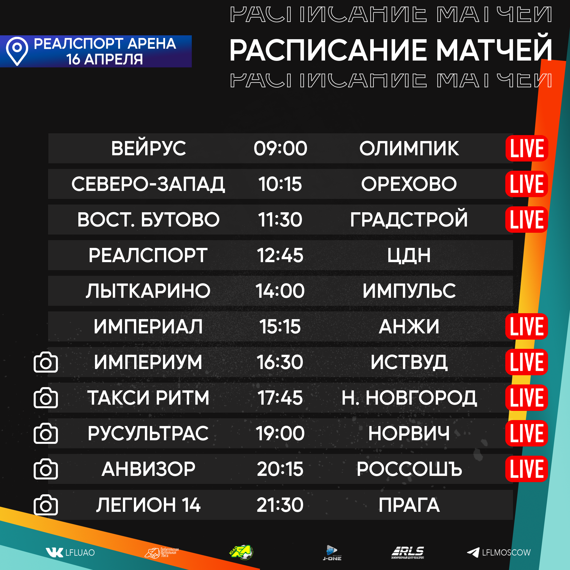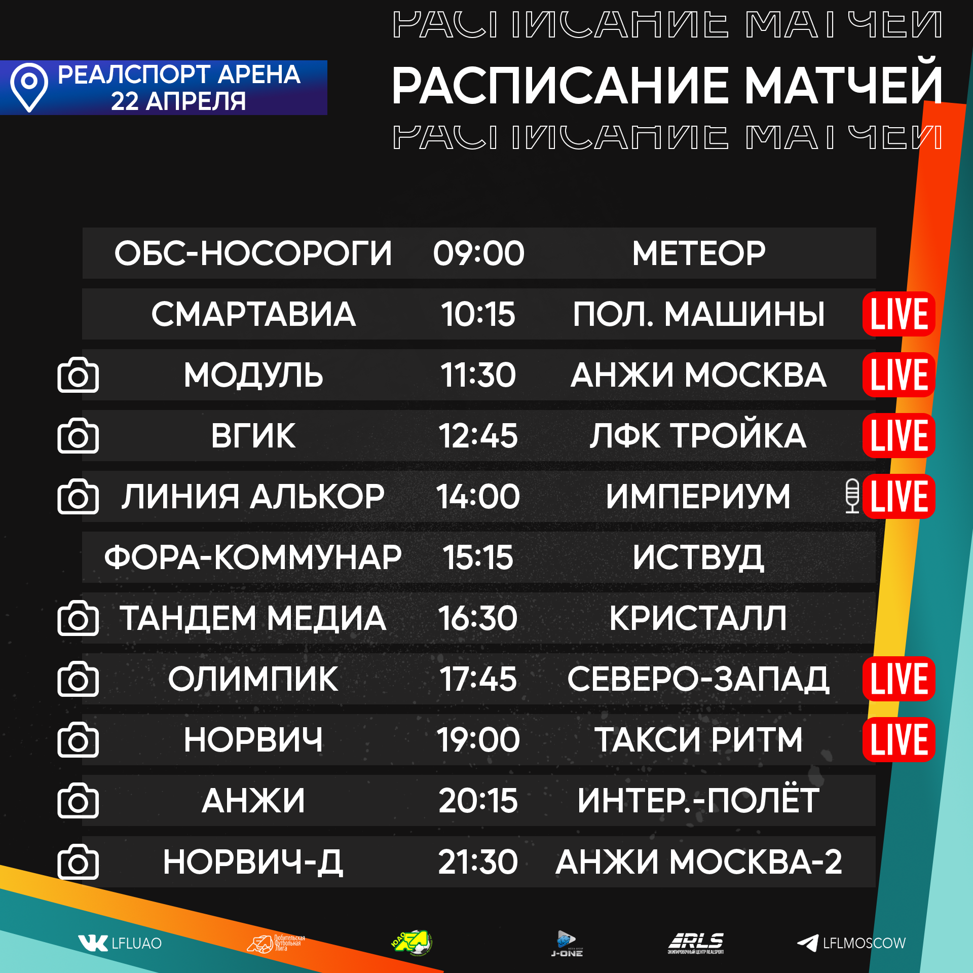 Медиа21.04.2023 Новый футбольный уик-энд уже выглядывает из-за горизонта, а мы с вами готовимся встречать его, ведь нас ожидает ряд интереснейших противостояний во внутренних чемпионатах Подробнее21.04.2023 «Дайджест 2. КФЛ 2023. Вратарская пятница, звонок Неймару и голы в ворота Акинфеева». Сейчас большинство людей получают информацию или проводят большую часть времени в социальных сетях. Для этого мы ведем наши странички в Телеграмме (https://t.me/CFL2023_Moscow) и Вконтакте ( https://vk.com/lfl__russia ), на которые стоит безусловно подписаться. Подробнее20.04.2023 Расписание медиа Южной лиги ЛФЛ Представляем вашему вниманию расписание медиа Южной лиги ЛФЛ на предстоящий футбольный уик-энд Подробнее19.04.2023 Записи трансляций матчей с игровой недели 14-16 апреля Творческий коллектив Южной лиги ЛФЛ представляет вашему вниманию записи трансляций матчей, прошедших в выходные дни Подробнее19.04.2023 CFL 2023. Дайджест новостей № 1 Все новости читайте на официальной странице CFL cfl.lfl.ru Подробнее18.04.2023 Разбор полётов. Седьмая неделя Позади очередной футбольный уик-энд, который подарил нам немалое количество эмоций. Прошедшая неделя многим запомнится невероятными интригами, развязками Подробнее18.04.2023 Южная Лига ЛФЛ проводит донабор команд на сезон 2023 В связи с открытием нового стадиона Ясенево Южная Лига ЛФЛ проводит донабор команд на сезон 2023 Подробнее14.04.2023 Подходят к концу рабочие будни, а это означает, что впереди нас ожидает яркий и эмоциональный футбольный уик-энд. Календарь подарил нам немало интересных вывесок Подробнее13.04.2023 Расписание медиа Южной лиги ЛФЛ Представляем вашему вниманию расписание медиа Южной лиги ЛФЛ на предстоящий футбольный уик-энд Подробнее12.04.2023 Мы начинаем серию публикаций, в которых будем знакомить наших читателей с командами участниками КФЛ 2023. А также представлять вашему вниманию звезд турнира, его участников, комментаторов и болельщиков. Все это в ближайшее время на нашем сайте и в социальных сетях. Подробнее |