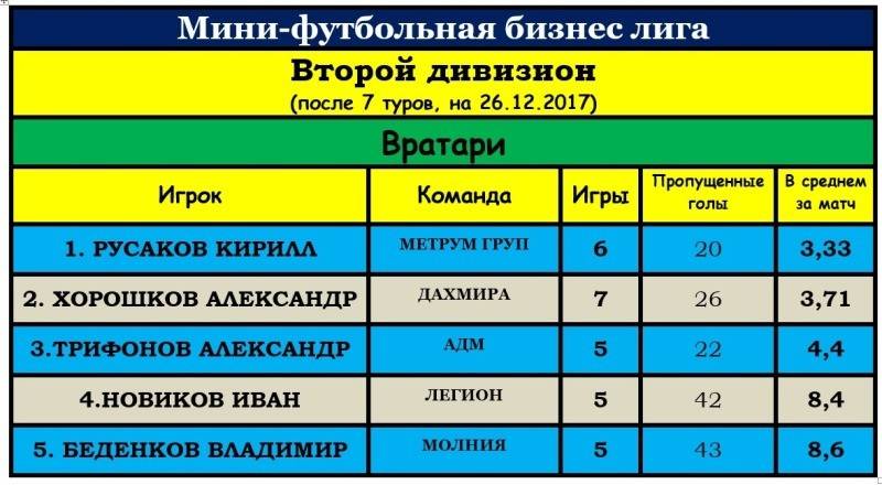 Среди вратарей тройка такая: Юрий Саленков из «Кристалла» (в среднем 1,6 гола за игру); Артем Дубовской из «Полета» (2,66) и Николай Миневич из «Центр Суши» (5,25).