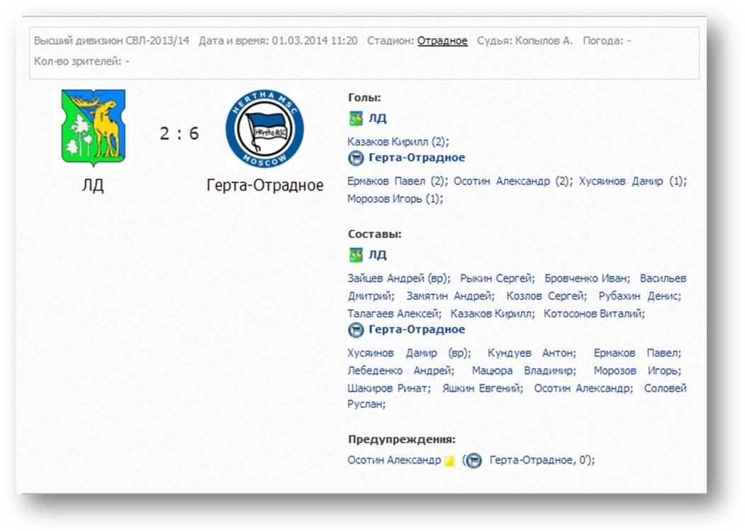 Высший дивизион СВЛ-2013/14 Дата и время: 12.01.2014 19:30 Стадион: Отрадное Судья: Воробьёв Е.