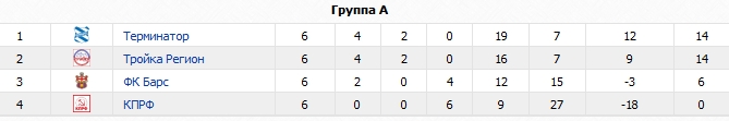 Поединки с «КПРФ» получились также «спаренные» (из-за переноса) и по характеру и сценария матчей получились совершенно разными. Стоит отметить, что на оба поединка с «коммунистами» нам удалось собрать оптимальный (для первой половины сезона) состав (особенно на домашний матч). Из-за проблем с составом «КПРФ» не смогла дать бой в домашнем поединке, а наши игроки остановились на итоговых 0-4 к трети второго тайма, хотя предпосылки к развитию успеха были (в итоге, возможно, именно в этом матче мы упустили 1 место в группе, не сумев улучшить разницу в тот момент, когда это было необходимо и вполне возможно). А вот домашний поединок с «КПРФ» получился по настоящему боевой! Я глубоко убежден, что если бы представители Северо-Востока на каждый матч группового этапа ЛЧ выходили с таким настроем, а, главное, в таком составе, то интрига в нашей группе жила бы до последнего тура. Преодолев ожесточенное сопротивление соперника, нам удалось одержать волевую победу со счетом 4-2, тем самым обеспечив досрочный выход из группы. Очень жаль, что представители Северо-Востока не смогли оказать аналогичное сопротивление в последнем туре Терминатору, крупно уступив 2-7. А «Тройка Регион», в свою очередь, в очередной раз обыграла «Барс» в выездном матче (3-2).