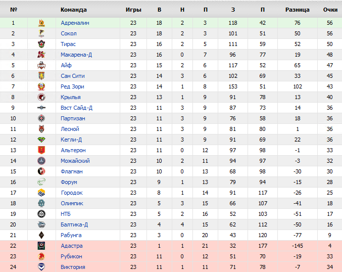 Традиционно, как и полагается, у нас определилась тройка победителей, которые пополнят свои коллекции новыми трофеями и, конечно же, пристальное внимание в прошедшем уикенде приковывалось к матчам «Адреналина» и «Сокола», затаившие интригу о чемпионстве до последнего тура. Итоговая турнирная таблица представляется нам в следующем виде: