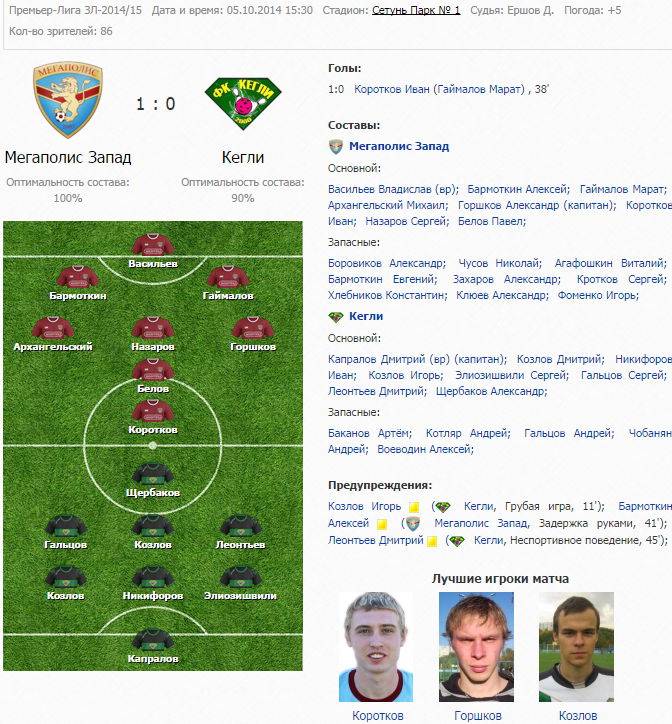 Вперед Кегли сломя голову не побежали, дабы не напороться на второй гол в свои ворота. Тактика их оказалась верной, ибо моментов у Мегаполиса не возникало вовсе. А вот сами «черно-зеленые» должны были забивать как минимум дважды. Щербаков был с мячом во вратарской, но игрок, видимо. пожалел Васильева и пробил мимо ворот. Время заканчивалось и арбитр добавил две дополнительные минуты. С этим был не согласен Ковальчук, желая поскорее зафиксировать победный результат. Уже и две минуты подходят к концу, но Кегли успевают заработать угловой. Ершов любезно предоставляет им его разыграть. Подача в штрафную и Козлов Дмитрий бьет с двух метров головой, но мяч пролетает в сантиментах от штанги. Забей он мяч, это была бы эпичная концовка. Играя от обороны, нужно все-таки реализовывать свои немногочисленные моменты. Кстати, это чуть ли не главная беда Кеглей. Можно биться не жалея себя, можно идеально играть в защите, можно на дриблинге проходить нескольких оппонентов, но если ты не реализовываешь редкие моменты, то обычно не побеждаешь. А Кеглям голы даются с большим трудом, и по этому показателю команда разделяет последнее место с Арсеналом, забив всего 11 мячей.