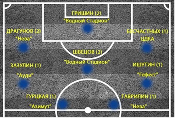 Ряды команд, расположившихся в подвале турнирной таблицы с "баранкой" в графе "набранные очки", покинул "Азимут". Формальные новички высшей лиги, располагающие при этом опытными и поигравшими на серьезном уровне футболистами, доказали, что их рано списывать со счетов и определять в аутсайдеры. На утряску состава, налаживание игровых связей и нахождение азимута на экватор турнирной таблицы Виталию Гурцкая и компании потребовалось всего 3 игры. Причем результат выглядит тем достойней, что обыграть удалось "Космос", получивший хорошую прессу после двух первых игр. Хет-трик записал на свой счет сам новоиспеченный играющий тренер "Азимута", в еще одном взятии ворот Гурцкая выступил ассистентом. Гол и две результативные передачи в актив записал Ершов. У "Космоса" дублем отметился Дмитрий Акимов вместе с Александром Швецовым из "Водного" возглавивший список лучших бомбардиров турнира.