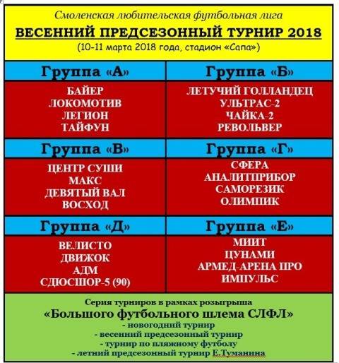 В минувшие праздничные выходные (10-11 марта) закончился второй 2-х дневный турнир в рамках СЛФЛ в 2018 году – ВЕСЕННИЙ ПРЕДСЕЗОННЫЙ ТУРНИР. Этот турнир продолжил розыгрыш «Кубка большого футбольного шлема 2018 года» (всего будет 4 турнира в зачет). Многие команды в первую очередь его как рассматривали как этап подготовки к вот-вот стартующему весеннему чемпионату 6х6.