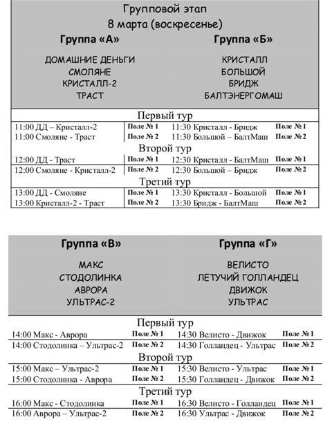 Время игр: указанные выше дни, с 15:00 до 20:00 (зависит от количества групп и команд).