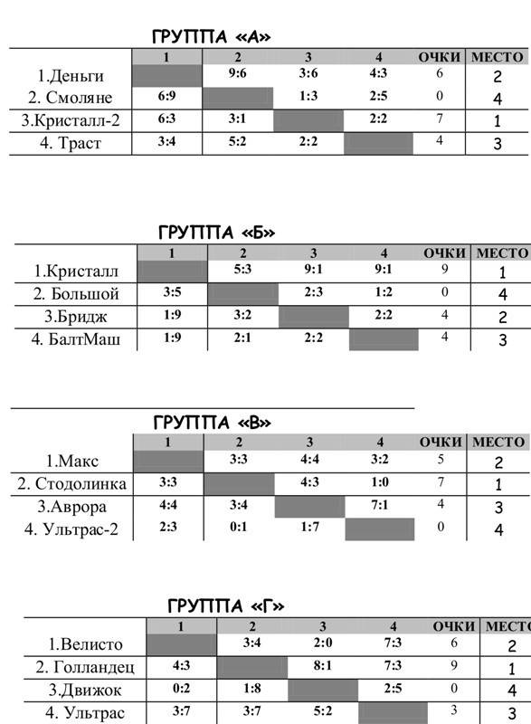 Попробуем предположить, что в полуфиналах встретятся «Кристалл» - «Гнёздово» и «Макс» - «Кристалл-2"». Начало матчей в 13:00 и 13:15.