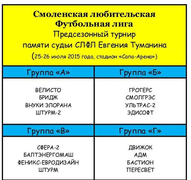 25-26 июля на стадионе Сапа-Арена 16 команд лиги примут участие в турнире памяти судьи лиги Евгения Туманина.