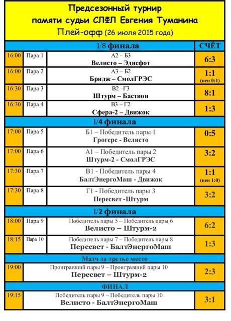 26 июля – плей-офф с 1/8 или 1/4 финала (зависит от количества команд). Время игр ориентировочно с 15:00 до 20:00.