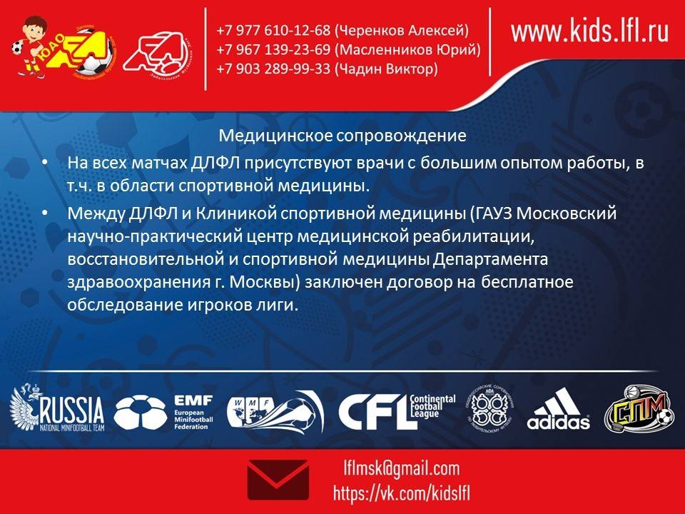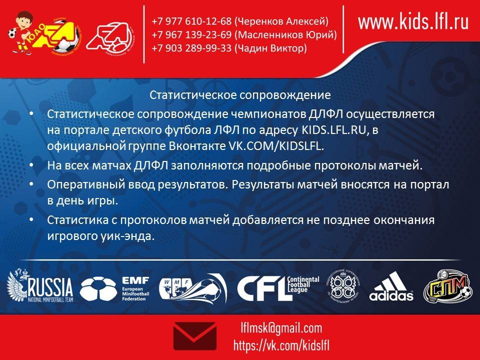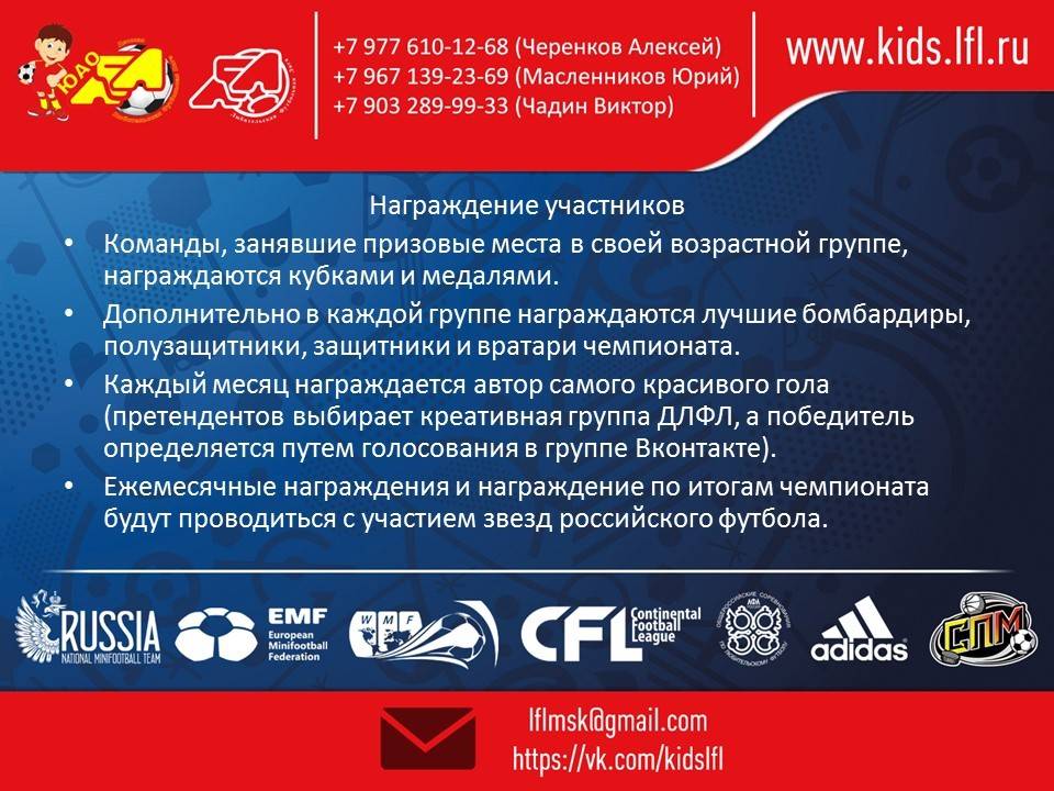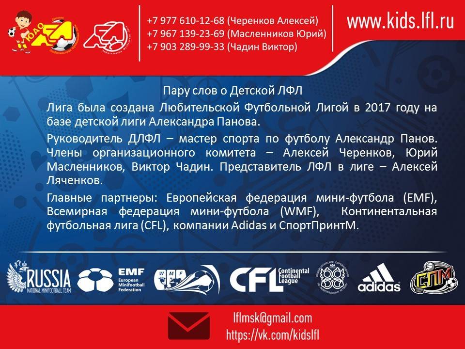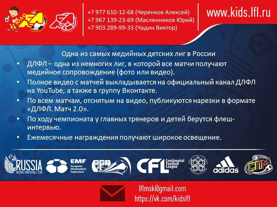 Детская лига ЛФЛ гарантирует Вам проведение детских соревнований на высочайшем уровне, самое полное медийное освещение, а самое главное - сохранение стоимости участия даже в период аренды залов в зимний период.