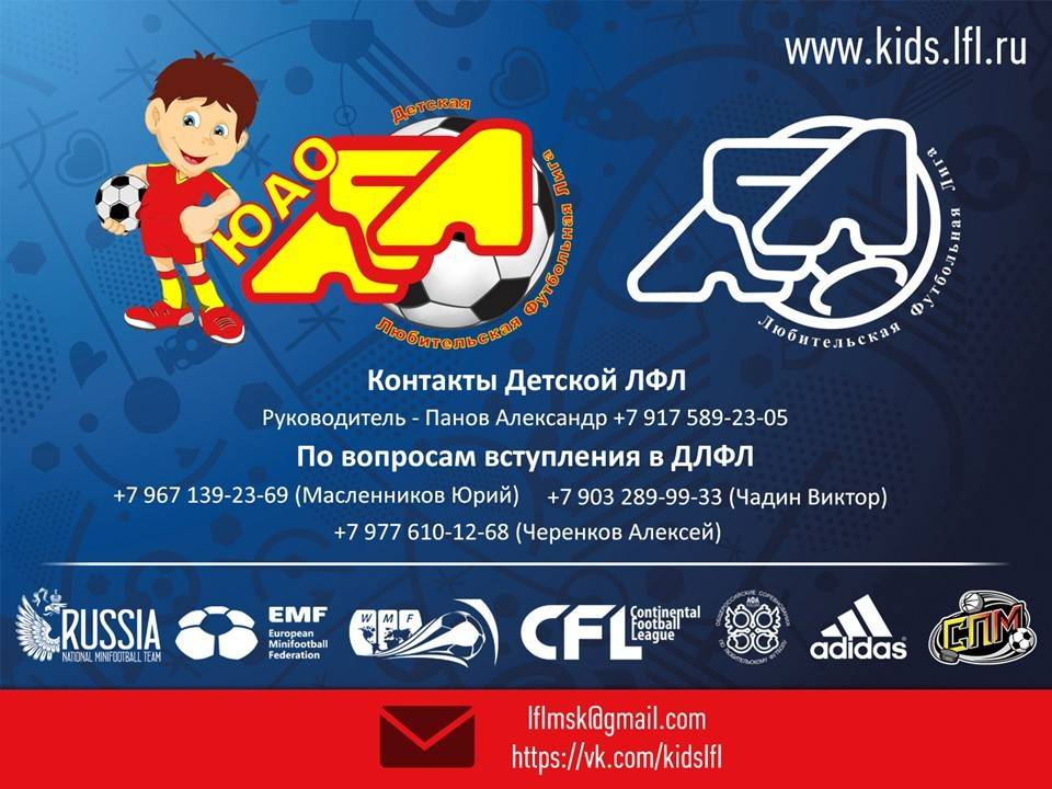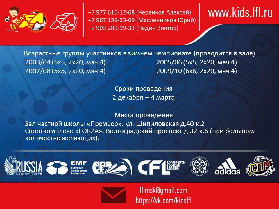 Детская лига ЛФЛ приглашает Вас принять участие в зимнем чемпионате ДЛФЛ, который будет проводиться в залах частной школы "Премьер" (м. Шипиловская) и Forza Sport (м. Волгоградский проспект) в 4 возрастных группах (03/04, 05/06, 07/08, 09/10).