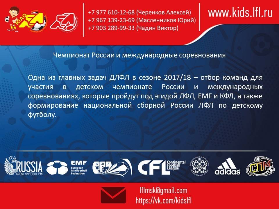 Уважаемые руководители клубов, родители и болельщики. До конца недели руководство ДЛФЛ подготовит для Вас презентацию-приглашение на зимний чемпионат ДЛФЛ, который пройдет в лучших залах Южного округа Москвы.
