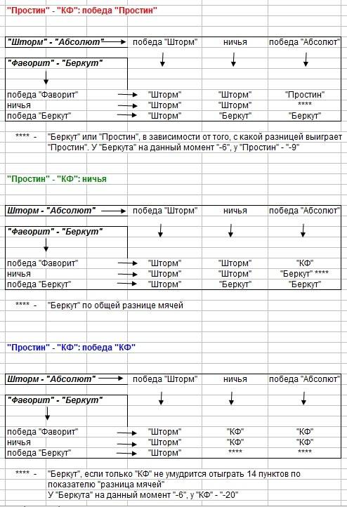 Если "Беркут" побеждает в этом матче, а "Шторм" у "Абсолюта" не выигрывает, то "Беркут" попадает-таки в стыковой матч. Если анонсируемый матч "Беркут" не выигрывает, то возможно большое количество вариантов (см.ниже).