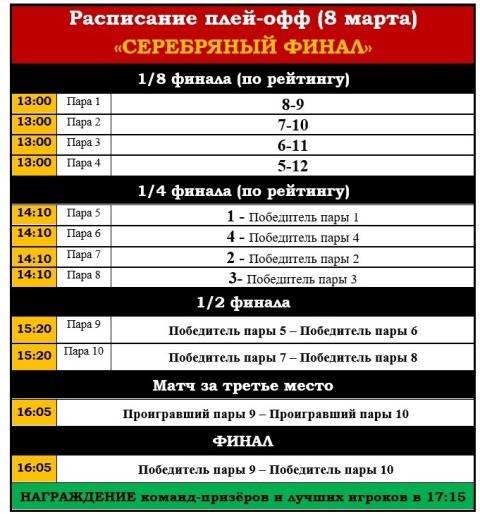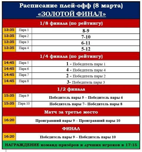 При определении пар ПЛЕЙ-ОФФ будет использоваться следующая уже опробованная схема. Каждая команда в "золотом" и "серебряном" финалах получает рейтинг от 1 до 12 в зависимости от своих мест в группах и набранных очков (будет дополнительный стимул набирать очки и делать хорошую разницу мячей для более высокого «посева» в плей-офф).