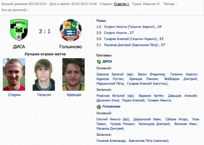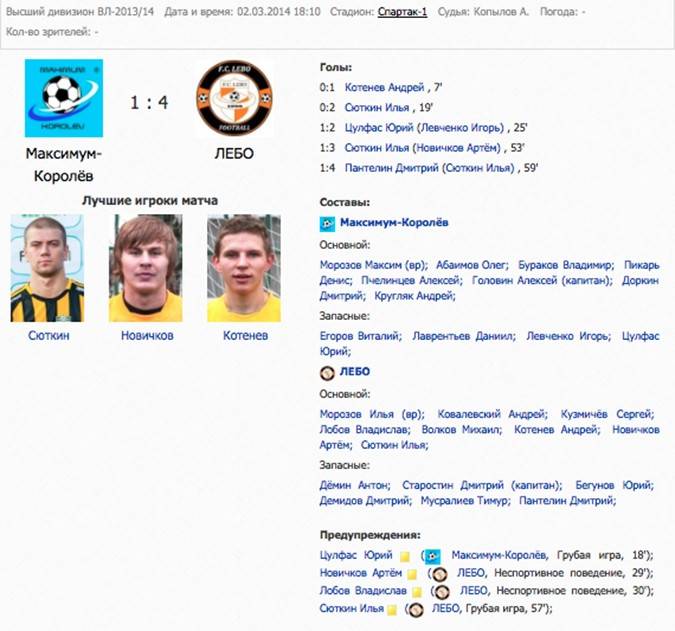 Медиа14.03.2014 В эти выходные в Высшем дивизионе Восточной Лиги будет сыгран двадцать второй тур. Кроме него, состоится одна игра двадцатого тура и долгожданные первые матчи 1/8 финала Кубка ЛФЛ! В Матче тура «Нижгары-Минерал» сойдутся в очной схватке с «ВИМ-АВИА», в рамках двадцатого тура состоится матч «Сборной РМА» и «Титана», а в Кубке ЛФЛ участие возобновят «Мортон», «Нижгары» и «РМА». Уик-энд получится насыщенным, а предваряет его традиционное превью, подготовленное пресс-службой Восточной Лиги. Подробнее13.03.2014 Девятого марта в Высшем дивизионе Восточной Лиги прошли все матчи двадцать первого тура. Он был богат на красивые победы и забитые мячи. «Мортон» забил двенадцать мячей «Титану», «ЛЕБО» потерпело первое поражение в первенстве, а «Технопул» сумел-таки победить! 37 голов в семи матчах – больше пяти мячей в среднем за игру! Обзор этого животрепещущего тура подготовлен пресс-службой Восточной Лиги. Подробнее12.03.2014 В Матче тура двадцать первого игрового дня Высшего дивизиона Восточной Лиги сразились «Усадьба Банная» и «Профит». «Банщики» уверенно идут на втором месте в чемпионате, а «Профит» после прошлого тура сумел подняться аж на пятую строчку! Битва получилась очень упорной. До самого финального свистка не было понятно, чем же это все закончится. И все же «Усадьба» удержала победный счет. Перипетии этой великолепной встречи – в традиционной рубрике Матч тура, подготовленной пресс-службой Восточной Лиги. Подробнее08.03.2014 Девятого марта одним днем будет сыгран весь двадцать первый тур Высшего дивизиона Восточной Лиги. Мы вступаем в последнюю треть этого невероятного марафона, который близится к своей развязке. В центральном матче тура «Усадьба Банная» сразится с «Профитом», шагнувшим уже на пятую строчку. Набравший ход «ЛЕБО» ждет испытание «Нижгарами-Минерал», а «Ураган» попробует остановить «Сборную РМА». Превью этих и других матчей подготовлены пресс-службой Восточной Лиги. Подробнее07.03.2014 В минувшие выходные был сыгран двадцатый тур Высшего дивизиона Восточной Лиги. Он был разбавлен перенесенной игрой восемнадцатого тура, в которой «Коньково» в упорной борьбе уступило «Усадьбе Банной». В самом туре «Коньково» в вынесенной на субботу игре было сильнее «ВИМ-АВИА», «ЛЕБО» сумел переиграть «Максимум-Королев» и по-прежнему не проигрывает в Высшем дивизионе. В Матче тура «Профит» был сильнее «Урагана». Подробный обзор этих и других матчей подготовлен для вас пресс-службой Восточной Лиги. Подробнее06.03.2014 В Матче тура в рамках двадцатого игрового дня встретились «Профит» и «Ураган». «Два огня» – так пресс-служба Восточной Лиги окрестила эти две команды. Победные серии каждой из них воодушевляли и обещали яркое зрелище на стадионе «Спартак». И оно действительно получилось! Детальный обзор Матча тура подготовлен пресс-службой Восточной Лиги. Подробнее01.03.2014 В субботу и воскресенье будет сыгран двадцатый тур Высшего дивизиона Восточной Лиги. В Матче тура «Профит» и «Ураган», показывающие в последнее время великолепные результаты, сойдутся в очной схватке. «Коньково» предстоят две игры на этой неделе – с «ВИМ-АВИА» и «Усадьбой Банной» в рамках восемнадцатого тура. А «Мортон» проэкзаменует «Технопул». Подробнее28.02.2014 Девятнадцатый тур Высшего дивизиона Восточной Лиги, последний за эту календарную зиму, принес п