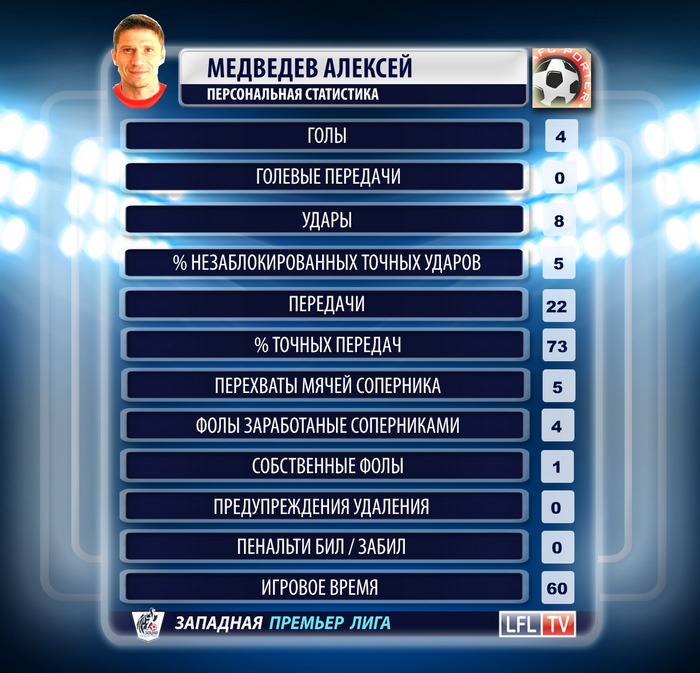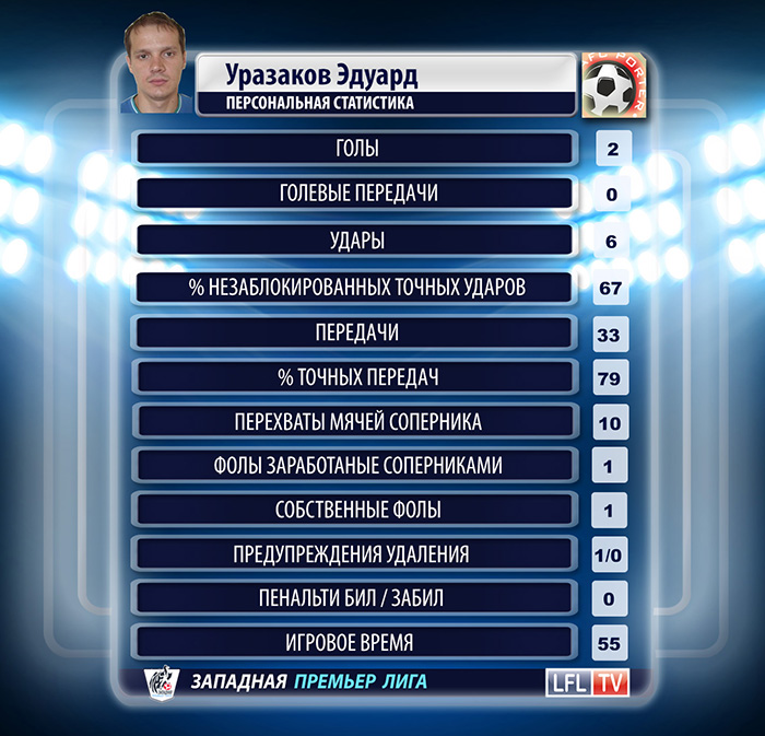 В конце, как обычно, обратимся к личной статистике. На этот раз под прицел попали Бирюков(ФКСП) и Лихобабенко(ФК Барс). Оба этих футболиста в значительной степени определяют игру своей команды, являясь важным звеном в командном механизме. Посмотрим, насколько успешно они справились со своей ролью в этом матче.