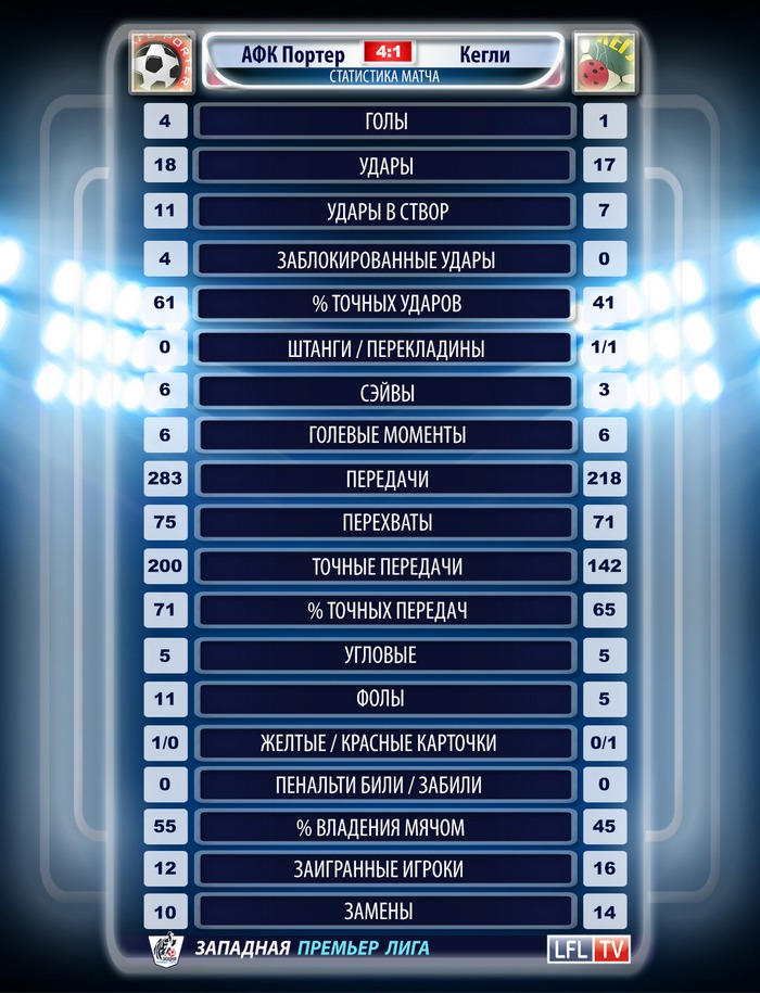 Сегодня любителям статистики к обзору предлагается матч 8-го тура АФК Портер – Кегли. Как обычно разобрали игру на винтики, дабы разглядеть основные причины итогового превосходства одной команды над другой. Также вашему вниманию для анализа предлагается статистический разрез двух футболистов соперничавших команд, чьи позиции на поле свели их в свой отдельный микроматч.