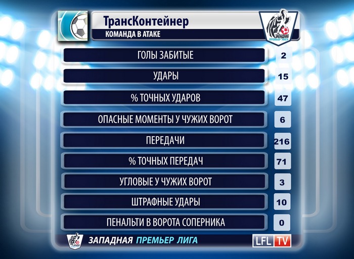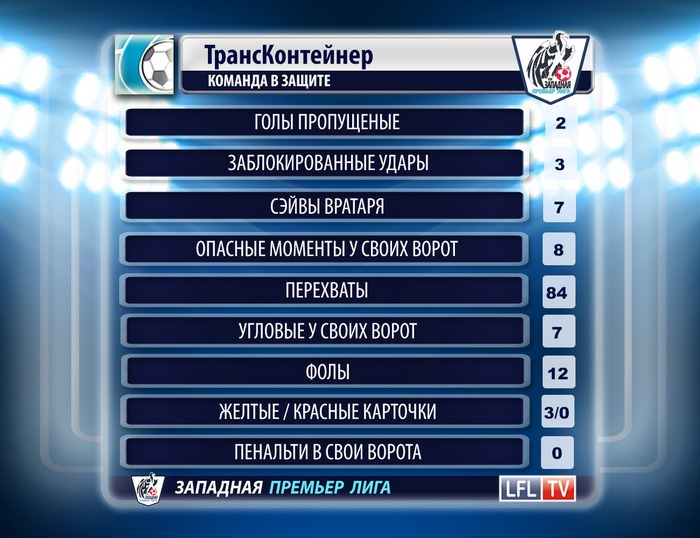Медиа20.04.2018 «ВСТРЕЧАЙ ГОСТЕЙ, РОДНАЯ СЕТУНЬ!» (превью матчей Лиги Чемпионов, Кубка ЛФЛ и 26-ого тура чемпионата) В народе принято говорить: «В гостях хорошо, а дома – лучше». Команды Западной Премьер-лиги ожидают ответных встреч финала Лиги Чемпионов и Кубка ЛФЛ. В грядущие выходные на Сетуни 1 (кто забыл адрес – улица Толбухина, дом 10) состоятся четыре из пяти еврокубковых «ответок», однако после выездных игр первого раунда возникает вопрос: а куда ещё лучше, господа? Подробнее17.04.2016 На прошлой неделе команды с Запада проводили свои первые матчи плей-офф в еврокубках. И сегодня вашему вниманию будет представлена статистику двух команд с Запада. Подробнее07.04.2016 В канун Лиги чемпионов "Восточное время" вновь приходит к вам. Пресс-служба Восточной Лиги вместе с dt group представляют новый выпуск программы о Лиге, шесть клубов которой вошли в число четвертьфиналистов "еврокубков". Подробнее03.04.2016 Сычев пришел, дебютировал и победил. АНАТОМИЯ ИГРЫ. Атлантис - Куркино 6:1. Сегодня в рубрике «анатомия игры» разберем очень интересную игру с участием клуба с Запада в кубке ЛФЛ. Атлантис принимал гостей из Северо-Запада, команду Куркино. В первом матче плей-офф «атланты» уступили 0:4, и в отчетной встрече перед командой Андрея Акименко стояла задача как минимум отыграть этот солидный гандикап, а как максимум сделать разницу больше четырех мячей, чтобы избежать нервотрепки в серии пенальти. Атлантис план выполнил, уложившись в основное время, и теперь идет дальше. Подробнее20.03.2016 АНАТОМИЯ ИГРЫ. Космос - АФК Портер 2:5. Возобновился чемпионат, а вместе с ним возвращается и постоянная рубрика «анатомия игры». Голы пропущенные, голы забитые, передачи, удары в створ и мимо, голевые моменты, сэйвы вратарей – вся подробная статистика будет разобрана на винтики, и представлена для вашего внимания. Подробнее25.12.2015 Восточное время. Спецвыпуск 10 с Артёмом Хачатуряном В каком виде дальше будет существовать «Квазар», за какие команды Востока нынешний спортивный директор армянской «Мики» переживает до сих пор, в чём главные беды и проблемы российского футбола - всё это вы узнаете из беседы Александра Палюткина с Артёмом Хачатуряном в десятом выпуске программы «Восточное время». Подробнее11.12.2015 АНАТОМИЯ ИГРЫ. В программе выходных была встреча, которая на общем фоне выделялась своей вывеской. ФКСП и Барс проводили вынесенный матч 9-го тура, в котором на кону стояла вторая строчка турнирной таблицы. В случае победы, «прокуроры» обгоняли команду Дмитрия Смирнова, сместив «теневого» лидера со своего места. Но этого не произошло. Игра завершилась боевой ничьей, второй подряд за выходные для Барса. А у нас появился повод разобрать, что же всё-таки привело к такому результату. Подробнее15.10.2015 АНАТОМИЯ ИГРЫ. Обойти стороной, и не разобрать по косточкам, встречу двух претендентов на самые высокие места было бы неправильно. Потому вашему вниманию предлагается детальный статистический анализ матча Атлантис – ТрансКонтейнер, прошедший в воскресение в рамках 9-го тура. Подробнее08.10.2015 Сегодня любителям статистики к обзору предлагается матч 8-го тура АФК Портер – Кегли. Как обычно разобрали игру на винтики, дабы разглядеть основные причины итогового превосходства одной команды над другой. Также вашему вниманию для анализа предлагается статистический разрез двух футболист
