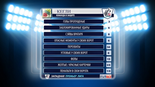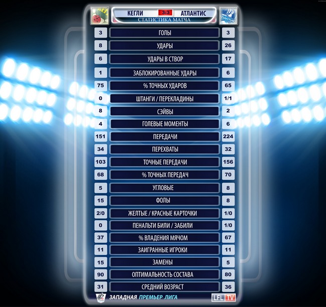 Общекомандная статистика лишь подтверждает наши акценты. Очевидна ставка первых на оборону, вторых на атаку. Обратите внимание на показатели в разделах: удары, передачи и особенно % владения мячом. Ситуация привычная практически для любого матча с участием Атлантиса. Но и здесь при потерях в 20% состава у сине-голубых против 10% у черно-зеленых Атлантис оказывал серьезное давление на ворота соперника, заставив тех и в два раза больше фолить (как итог заработанный пенальти, пусть и неиспользованный) и чаще спасаться угловыми (так 8-й угловой и стал фатальным для команды Кегли). Средний возраст команд свидетельствует лишь о том, что оба коллектива достаточно опытны, а значит хорошо понимают, что должны делать на поле. Более молодые Кегли и менялись чаще «старичков» из Атлантиса аж в три раза, тем любопытнее, что футболистов на эту игру привезли и в матче их заиграли одинаково. Обратите внимание еще на один факт: все замены сине-голубые сделали в первом тайме, во втором – ни одной! Почему? Об этом ниже. Разберем игру каждой команды в атаке и защите.