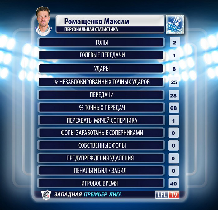 Ромащенко показал шикарную статистику по ударам. Треть от общего числа ударов команды нанес именно Максим. Как говорится: «есть удар – надо бить!». Хотя чаще всего после его выстрелов мяч летел мимо цели. Но если попадал в створ…! Два попадания – для гола для хит-парада недели. Только вот не помогли они команде добыть даже ничьей.