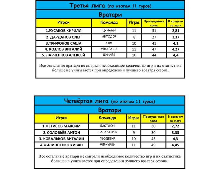"ЛУЧШИЙ ВРАТАРЬ" в каждой из лиг.