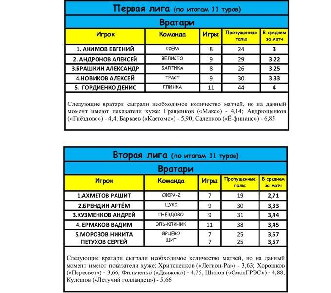 Статистика на сайте лиги в разделе "вратари" для многих вратарей недостоверная ,так как технически нет возможности отмечать не полные матчи и там показываются игроки, сыгравшие минимум 50% матчей.