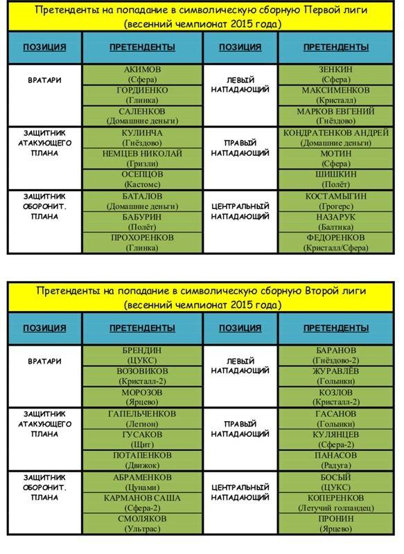 нападающие – Баранов (Гнёздово-2), Журавлёв, Гасанов (оба Голынки), Козлов (Кристалл-2), Кулянцев (Сфера-2), Панасов (Радуга), Босый (ЦУКС), Коперенков (Летучий голландец).