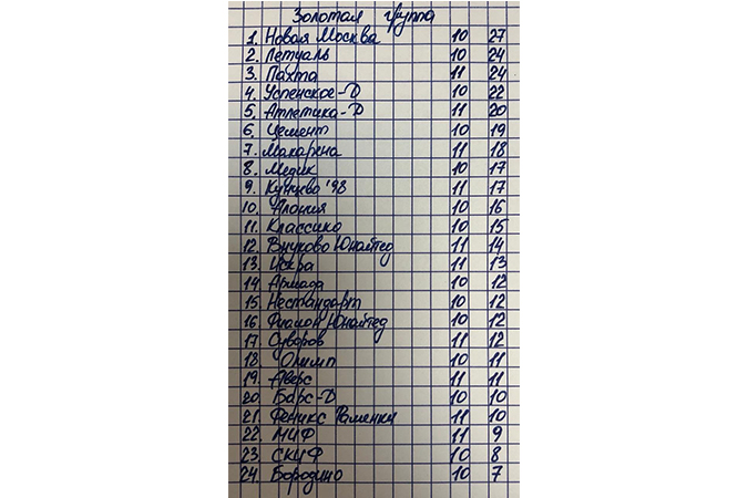 Зачем это нужно? Как рассказал президент, ранее дивизионы формировались по принципу «змейки», то есть так, чтобы средняя сила их участников была равна, поэтому объективность получения одинакового количества путёвок в более высокий дивизион вопросов не вызывала. В силу оттока большого количества команд и появления новых, неизвестных, дивизионы были сформированы «вслепую», без оглядки на силу участников. В связи с этим у Лиги нет уверенности, что дивизионы по своей силе равны. Как выявить сильнейших? Дать им всем возможность сыграть между собой, то есть 12 первых команд дивизиона «А» должны сыграть с 12 командами дивизиона «Б». Получат выходцы из каждого дивизиона в итоге по три путёвки – значит, «А» и «Б» были равны. Получат, скажем, «ашки» пять путёвок – сильнее была именно наша группа. Давайте взглянем, как выглядит на данный момент (без учёта оставшихся туров) виртуальная таблица Золотой группы: