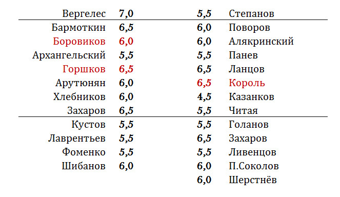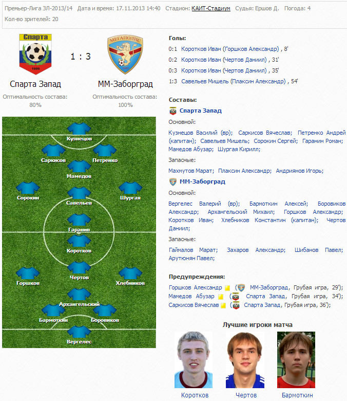 Совершенно очевидно, что самой высокой оценки достоин Коротков Иван, который, как ранее отмечалось, выступал на позиции нападающего. Несомненно, без помощи партнеров сделать хет-трик ему бы не удалось. Но сами понимаете, обертку надо еще и развернуть - оказаться в нужном месте, не опоздать с рывком, пробить, в конце концов. Оттягивая на себя защитников Спарты, Коротков зачастую создавал свободные зоны для партнеров. В общем, в этой игре новоявленный бомбардир делал все то, что и должен нападающий.