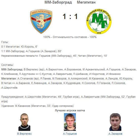 8-я минута: ГОЛ!!! Контратака Мегаполиса, Горшков на линии штрафной оставляет мяч пяткой Короткову. Ювелирным удар в дальний угол выводит Заборград вперед. Счет