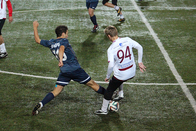 Почти вся игра прошла под знаменем атакующего футбола. Активнее выглядели номинальные хозяева, у которых впереди, как и всегда, выделялся капитан Смердин. Он и создал первый момент своей команды, но после его удара мяч пролетел мимо ворот. «Бадос» продолжал активное наступление, и на 11-й минуте номинальный вратарь Канунников, вышедший сегодня в поле, вывел «бело-зеленых» вперед! «РМА» удалось восстановить паритет спустя три минуты – Александр Кондауров, один из немногих оставшихся после прошлого сезона в команде, счет сравнял. До конца первого тайма обе команды имели возможности выйти вперед, и в последней пятиминутке тайма Смердин добился-таки своего, сделав счет 2:1 после первой половины встречи!