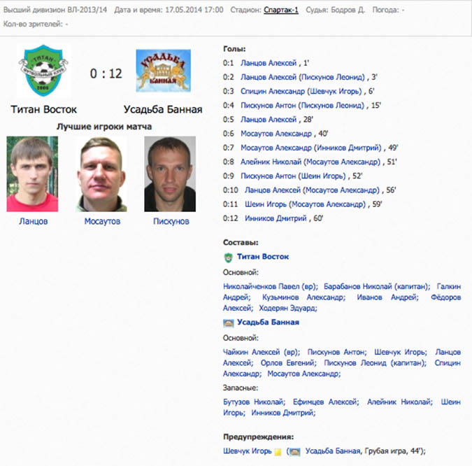 Глядя на счет, в целом можно понять то, что происходило на поле, но первое впечатление не будет до конца верным. Не стоит считать, что у «Титана» опустились руки еще в первом тайме. Начало второй половины игры осталось за командой Николая Барабанова, которая пыталась хоть как-то придавить к своим воротам «Усадьбу». Наиболее активным в составе «титановых» был Эдуард Ходерян, раз за разом финтами раскидывавший защитников «банщиков». Но на 40-й минуте полезный в этом матче Александр Мосаутов забил шестой гол «Усадьбы», а потом понеслось! За одиннадцать последних минут игры «Усадьба» огорчила вратаря «Титана» Николайченкова аж шесть раз! Дубли сделали Пискунов и Мосаутов, помимо этого трижды ассистировавший партнерам, четвертый свой мяч в игре провел Ланцов, по разу отличились Инников, Алейник и Шеин.