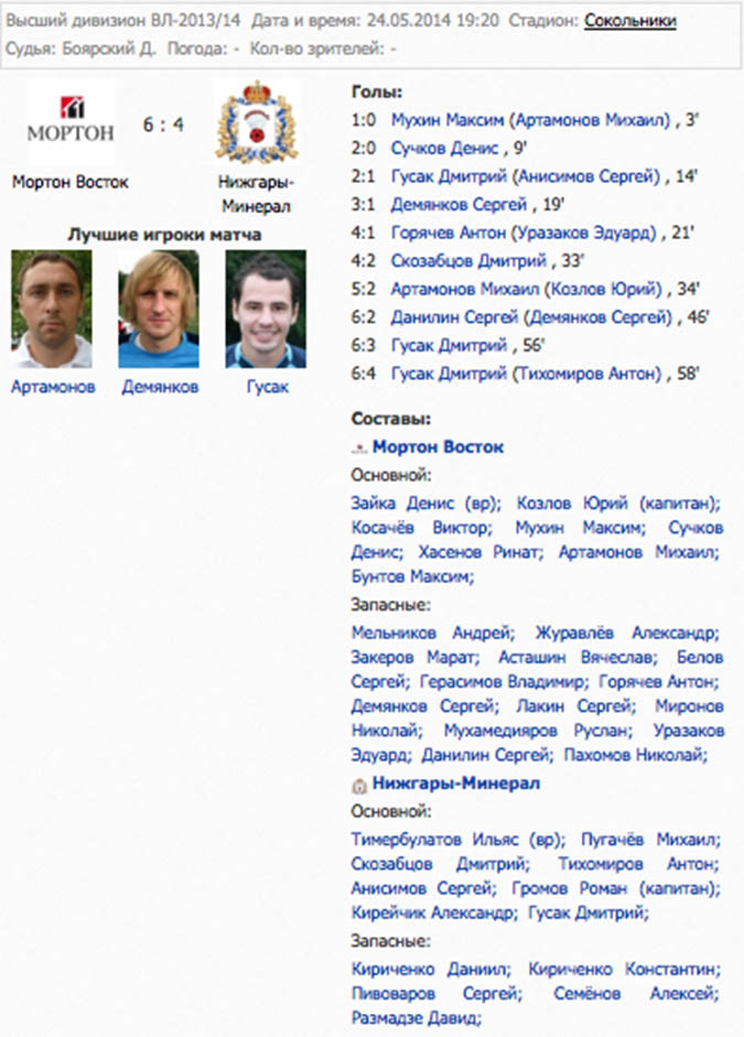 Второй тайм начался с двух голов, причем забиты они были в разные ворота. На 33-й минуте подключение к атаке Скозабцова привело к дальнему удару, и мяч от руки соперника и штанги оказался в сетке ворот. Однако через минуту Артамонов замкнул прострел Козлова пяткой – 5:2. И начался обстрел ворот Тимербулатова. Журавлев, Артамонов, Бунтов, Козлов, Демянков – все они упустили по моменту во втором тайме. «Мортон» откровенно «мастерился», понимая, что этот матч они уже не отдадут. И на 46-й минуте Демянков прострелил на дальнюю штангу, где совершенно один остался Сергей Данилин – 6:2.