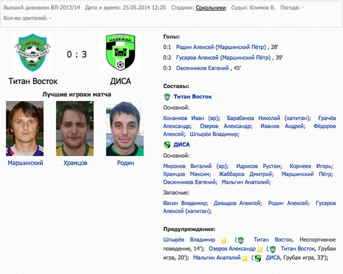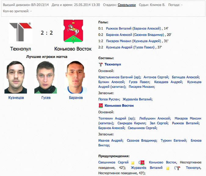 Второй тайм обещал быть копией первого – с вязкой игрой в центре, большим количеством борьбы и столкновений, как вдруг на 38-й минуте Андрей Казадаев исполнил штрафной удар с очень и очень дальней дистанции, да как исполнил! Мяч, пролетев выше всех в штрафной, залетел точно в ворота, застав врасплох Серикова. «Технопул» мог забивать еще, но после отличного паса из глубины Гусев, выходивший на рандеву с Сериковым, не пошел на сближение и нанес плотный удар из пределов штрафной, но угодил в штангу. «Технари» не успокаивались, и вот уже Кузнецов, качнув соперника на краю штрафной, хлестко пробил низом – 0:2. Но «ДИСА» отнюдь не собиралась отдавать матч просто так –лучший игрок матча Мальгин отменным пасом нашел в чужой штрафной Васина, и тот переправил мяч в сетку. А за три минуты до конца встречи скинул мяч Овсянникову, который, забив свой очередной гол, установил окончательный счет!