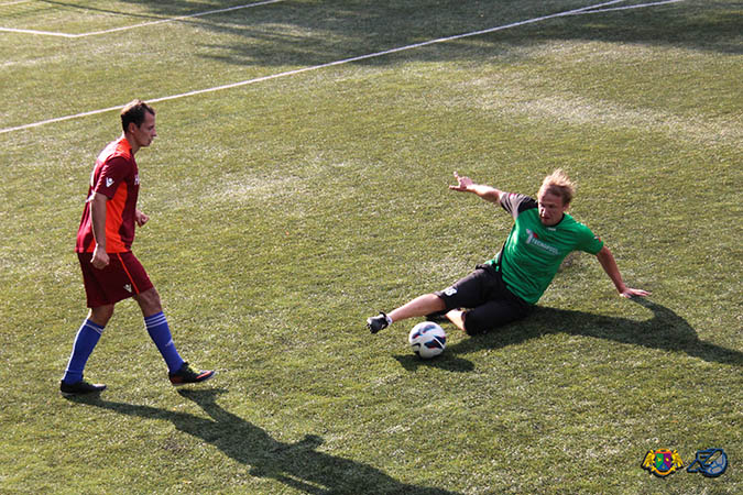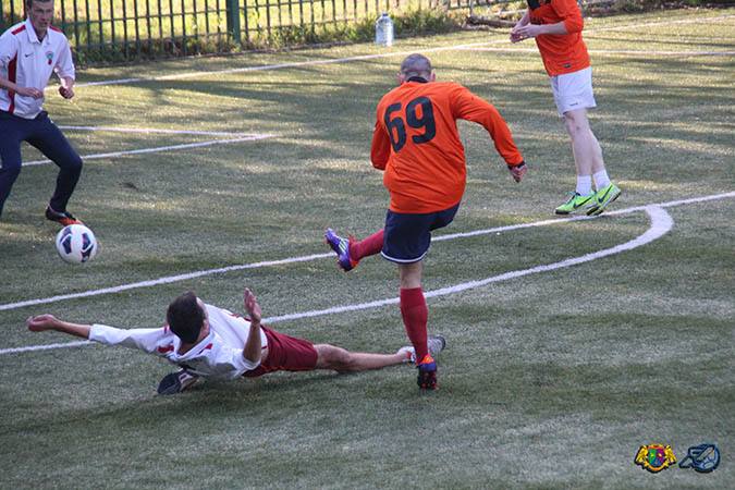 За первые десять минут зрители увидели два забитых мяча! На 3-й минуте Пажитнов замкнул прострел справа, отправив мяч в угол ворот пяткой – 0:1. Затем Артак Григорян отдал слева, а Алик Эльязян внес мяч уже в пустые ворота. Столь бурное начало игры предсказывало нам незабываемое зрелище. На 10-й минуте Ершов организовал момент у ворот «Сборной РМА», но Камилов дважды в блестящем стиле спас свою команду! А затем «Профит» организовал еще два мяча. НА 18-й минуте Зотов, впервые с зимы приехавший сыграть за «Профит», выдал передачу строго по центру поля, Пажитнов оторвался от защиты и переиграл Камилова – 1:2. А на 24-й минуте тот же Зотов отдал мяч Артемьеву, и тот с острого угла отправил мяч в сетку. Неожиданное развитие событий, правда? «Профит» был лучше в первом тайме и отправился на заслуженный трехминутный отдых в перерыве.
