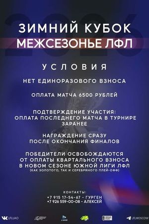 Медиа30.11.2025 Друзья, приглашаем принять участие в Зимнем кубке, который пройдет в период с 13 декабря по 22 февраля. После окончания регулярного чемпионата нужно поддерживать тонус для участия в новом сезоне! Предлагаем вам пройти путь в межсезонье вместе с нами. Подробнее27.11.2025 Расписание медиа Южной лиги ЛФЛ Представляем вашему вниманию расписание медиа Южной лиги ЛФЛ на предстоящий футбольный уик-энд Подробнее27.11.2025 Чемпионат России 2025. Номинанты Чемпионат России 2025 в ВК vk.com/lfl__russia и в Телеграм-канале t.me/lfl_rus Подробнее27.11.2025 ЛФЛ 5х5 объявляет набор команд на новый сезон 2026. Адрес манежа: ул.Авиаторов, 7Б (СК "Игра") ЛФЛ 5х5. Адрес манежа: ул. Авиаторов, 7Б (Солнцево) Подробнее24.11.2025 Записи трансляций матчей с игровой недели 22-23 ноября Творческий коллектив Южной лиги ЛФЛ представляет вашему вниманию записи трансляций матчей, прошедших в выходные дни Подробнее24.11.2025 Чемпионат России – 2025. Обзор финального игрового дня ФК Барс - пятикратный Чемпион России! Подробнее23.11.2025 Кубок Запада. Финал. АФК «Портер» - «ТрансКонтейнер». Расширенная статистика. Финал Кубка Запада, бесспорно, стал настоящим бриллиантом в короне сезона 2025. Украшением длиной в 80 минут. Ведь по регламенту в случае ничьи в основное время, в финале играются еще два дополнительных тайма по 10 минут. Еще двадцать минут ярчайшего футбола, за которые было забито больше мячей, чем за предыдущие 60. А «ТрансКонтейнеру» для победы хватило и вовсе трех последних минут. Как «Манчестер Юнайтед» в запомнившемся навсегда финале Лиги Чемпионов против «Баварии». Подробнее22.11.2025 Чемпионат России 2025. День четвёртый Чемпионат России 2025 в ВК vk.com/lfl__russia и в Телеграм-канале t.me/lfl_rus Подробнее22.11.2025 Чемпионат России 2025. Обзор четвёртого игрового дня Обзор 4-х матчей четвертьфиналов Подробнее21.11.2025 Чемпионат России 2025. Обзор третьего игрового дня 21-е ноября. Решающие матчи в группах Подробнее |