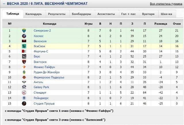 Лычко («Город Будущего») продолжает лидировать среди бомбардиров с 18 голами. Гончаров из «Галактики» забил 12 мячей. 11 раз отличился Алисултанов («Дикая Дивизия»).