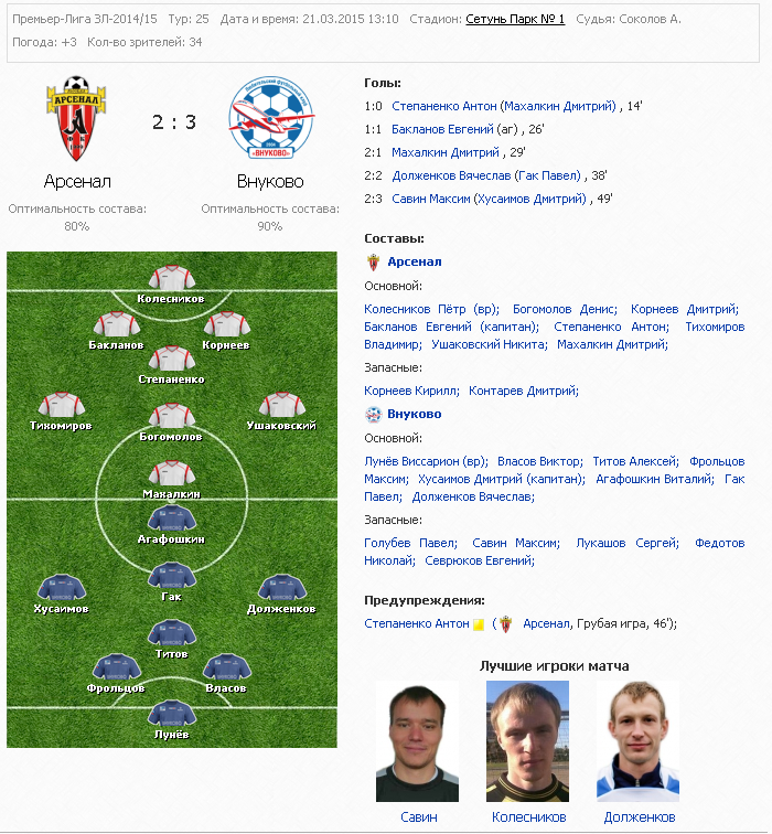 По логике, с самого свистка о возобновлении игры хозяева должны были начать сушку, но сперва они соорудили голевой момент – Корнеев сыграл в штрафной соперника в стеночку с Махилкиным и бил практически в упор. Однако мяч прокатился лишь в сантиметрах от штанги. После этого момента игра стала складываться так, что преимущество полностью захватили футболисты в синем. И на 38-й минуте гол в ворота Колесникова вытекал из логики игры. Гак и-за штрафной пробил, а Долженков эстетично подправил мяч пяткой во вратарской 2:2. Последующие 20 минут игрового времени также прошли под натиском «авиаторов», и их бомбардировок ворот Арсенала. Если бы не Колесников, интрига умерла бы гораздо раньше. Раз за разом голкипер «канониров» спасал партнеров, оставляя надежду на успешный исход. Но на 49-й минуте он был уже бессилен. Савин принял мял на линии штрафной, аккуратным движением оставил не удел Бакланова, и сразу же пробил по воротам. Мяч после удара нападающего влетел в девятку ворот Арсенала 2:3. За последние 10 минут наступило некоторое затишье. Внуково подсушило игру, не чураясь сыграть по простому возле своих ворот. А Арсенал стал ошибаться в передачах, пытаясь сыграть позиционно в атаке. Однако все попытки оказались тщетными. Красивым завершением матча стал момент с участием того же Савина. Почти с центра Максим запустил дугу через далеко вышедшего Колесникова, но мяч угодил в перекладину.