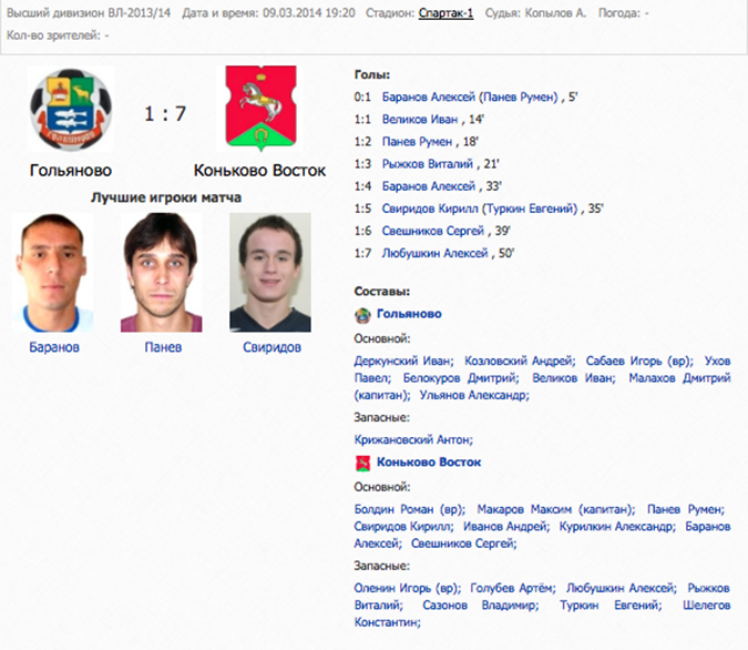 Вторая половина матча прошла под полным контролем «Профита». Хотя кто знает, как бы все обернулось, забей полузащитник «Гольяново» Ульянов в пустые ворота при счете 3:2. Но не забил, и вышло так, как вышло. Третий мяч в ворота «Гольяново» за авторством Гусенкова стал отправной точкой для подопечных Степанова. В последние десять минут все тот же Гусенков, дважды Пажитнов и Ершов довели счет до разгромного. Все, на что сподобилось «Гольяново», – третий гол, забитый Великовым в самой концовке игры.
