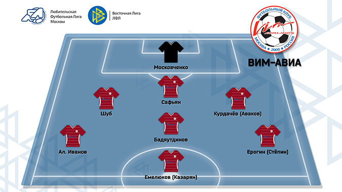 Состав «ВИМ-АВИА» нес в себе меньше сюрпризов. Альберт Минасян не смог приехать на игру, поэтому Ерогин занял место слева в полузащите, а Михаил Бадяутдинов, обычно отрабатывающий за ним, был выдвинут в центр поля. Свободное место слева в обороне досталось Максиму Курдачеву. Денис Степин остался в запасе.