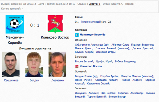 Тайм второй прошел почти по такому же сценарию, что и первый – «Коньково» владело игровым преимуществом, «Королев» же перешел на контратакующую модель. Неплохие шансы забить после ошибки оборонцев «красных» упустили Дмитрий Доркин и Владимир Бураков, после чего стало ясно, что автогол Головина так и останется единственным голом в этой встрече. Так оно и вышло, финальный свисток зафиксировал победу «красных».