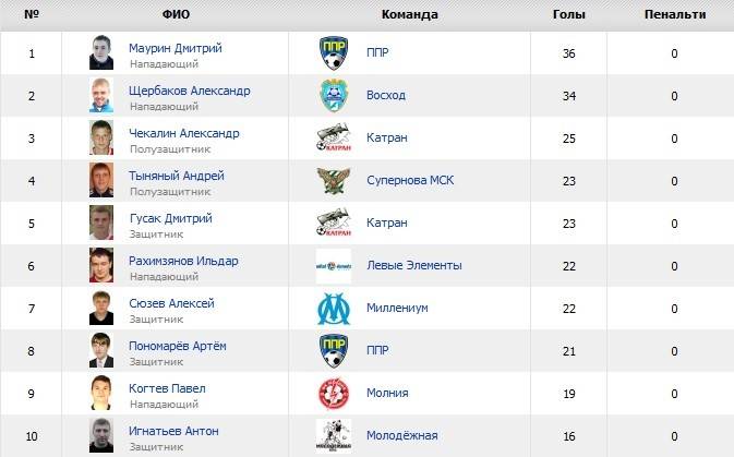Список бомбардиров первенства формировался не один день, поэтому каких-либо неожиданностей в себе не таит. Возглавляет десятку самых результативных игроков чемпионата Дмитрий Маурин из ППР - молодой и настырный форвард, забивший в последнем матче 6 мячей в ворота Аэрона. Но удержать верхнюю строчку будет непросто, ведь у Дмитрия очень сильные конкуренты: