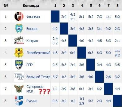 Вплоть до четвертого места идёт полная калька обычной таблицы. Матчи второго круга не шли в счет, а победителем круга первого ожидаемо стал Флагман. Почти что ровный баланс имеет БТ. ППР и Супернова - явные аутсайдеры. После двух недавних поражений от Катрана и Восхода, Флагману будет очень сложно стать победителем такого же рейтинга во втором круге, в прочем это будет мало кого волновать в случае общего успеха команды по итогам чемпионата.
