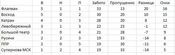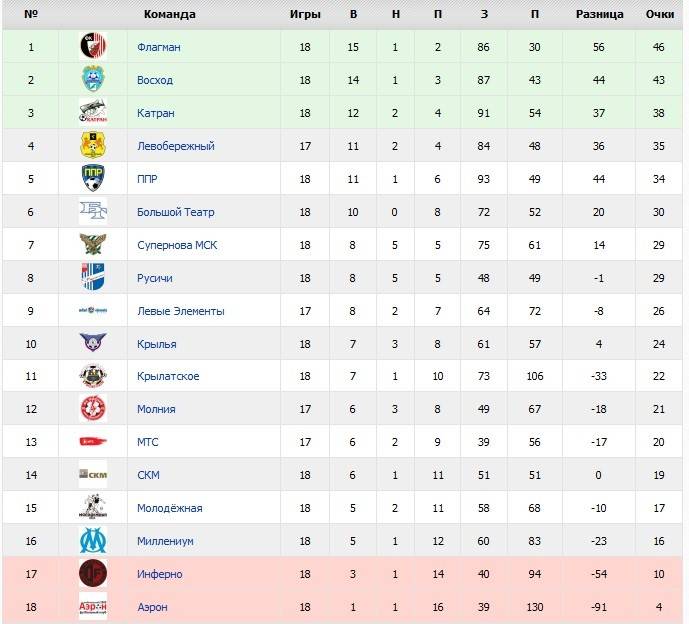 Вслед за Флагманом в верхней части таблицы расположились следующие коллективы: Восход, Катран, Левобережный, ППР, Большой Театр и Русичи. Супернову вынесем за скобки в силу вышеупомянутой специфичной ситуации. Хочется сразу оговорить, что деление на лидеров и аутсайдеров весьма условно, ведь, учитывая плотность в таблице, удачная серия вполне может расчистить путь к солнцу СКМ, Крыльям или Левым Элементам. Но сейчас первая восьмерка сформирована, и имеет четкие очертания с 46 до 29 набранных очков. Разница между 2ой командой и 8ой командами составляет 11 очков, которые невероятно сложно отыграть в лидерской мясорубке, но впереди еще целых 17 матчей, а значит, нет ничего невозможного.