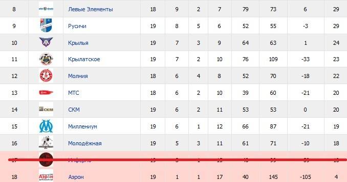 Вернемся к таблице. Особняком здесь стоят два коллектива - Флагман и Аэрон. Первая и последняя команды чемпионата, и, что любопытно, обе удивили со знаком минус, проиграв первые два матча после возобновления первенства. Вероятно, это первый и последний случай в этом сезоне, когда Аэрон и Флагман оказываются в одном предложении в статье без противопоставления. Несмотря на осечки, Флагман продолжается оставаться главным фаворитом турнира, и, вероятно, первым преодолеет отметку в 50 набранных очков. Да, право еще на одну ошибку у команды-триумфатора Зимнего Кубка есть, но Восход уже дышит в спину и наступает на пятки подопечным Дмитрия Башкина. Аэрон же продолжает терпеть бедствие, имея в активе жалкие четыре очка, три из которых достались команде в силу технического поражения Инферно. Последний матч был проигран с ужасающим счетом 23:1, и это анти-рекорд нынешнего первенства. Ниже падать некуда, команде нужна какая-то встряска. Только серьезные организационные выводы смогут вернуть в игру Аэрон, ведь до спасительно 15-го места целая пропасть в виде 12 очков, являющимися самым большим разрывом между любыми двумя соседствующими в таблице командами.